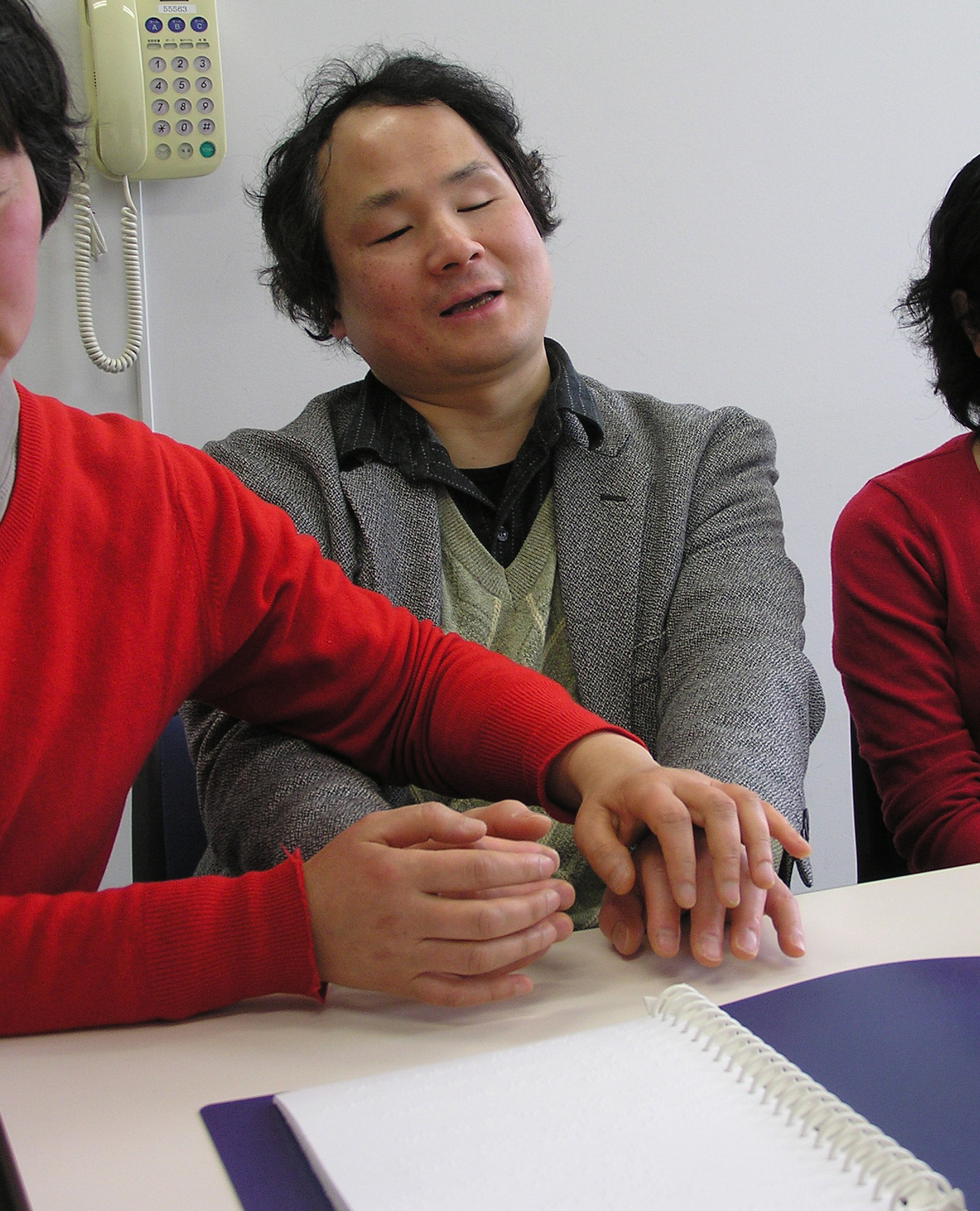 来客と会話をする福島。指点字で通訳介助者が同時通訳のように福島に目の前の人の外見、表情、話等、今何が起こり、何が見えるかなど細かく伝える。