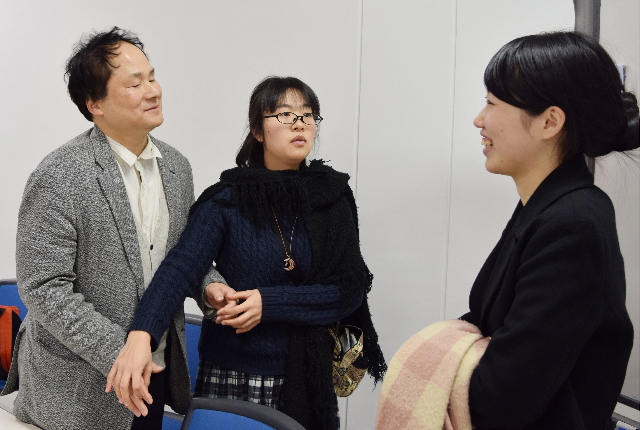 A:聞こえてきたことを伝えるのが原則なので。他の先生、たとえば、S先生とかと話しをしていても、「これは伝えなくていいから」って(笑)、よくおっしゃるんですけど、でも、ちゃんと伝えないと。福島さんは通訳を受ける時に両手をテーブルの上に置いてるから、たとえば、S先生が足を組み替えようとして、その足がテーブルにバーンとぶつかった時とか(笑)、振動が伝わるんですね。そういう時、「いまのは何?」って福島さんに聞かれたら、「S先生がテーブルに膝をぶつけた」って伝えるんだけと(笑)、S先生には「そんなことまで伝えなくていいよー」って、よく言われるんだけどね(笑)。